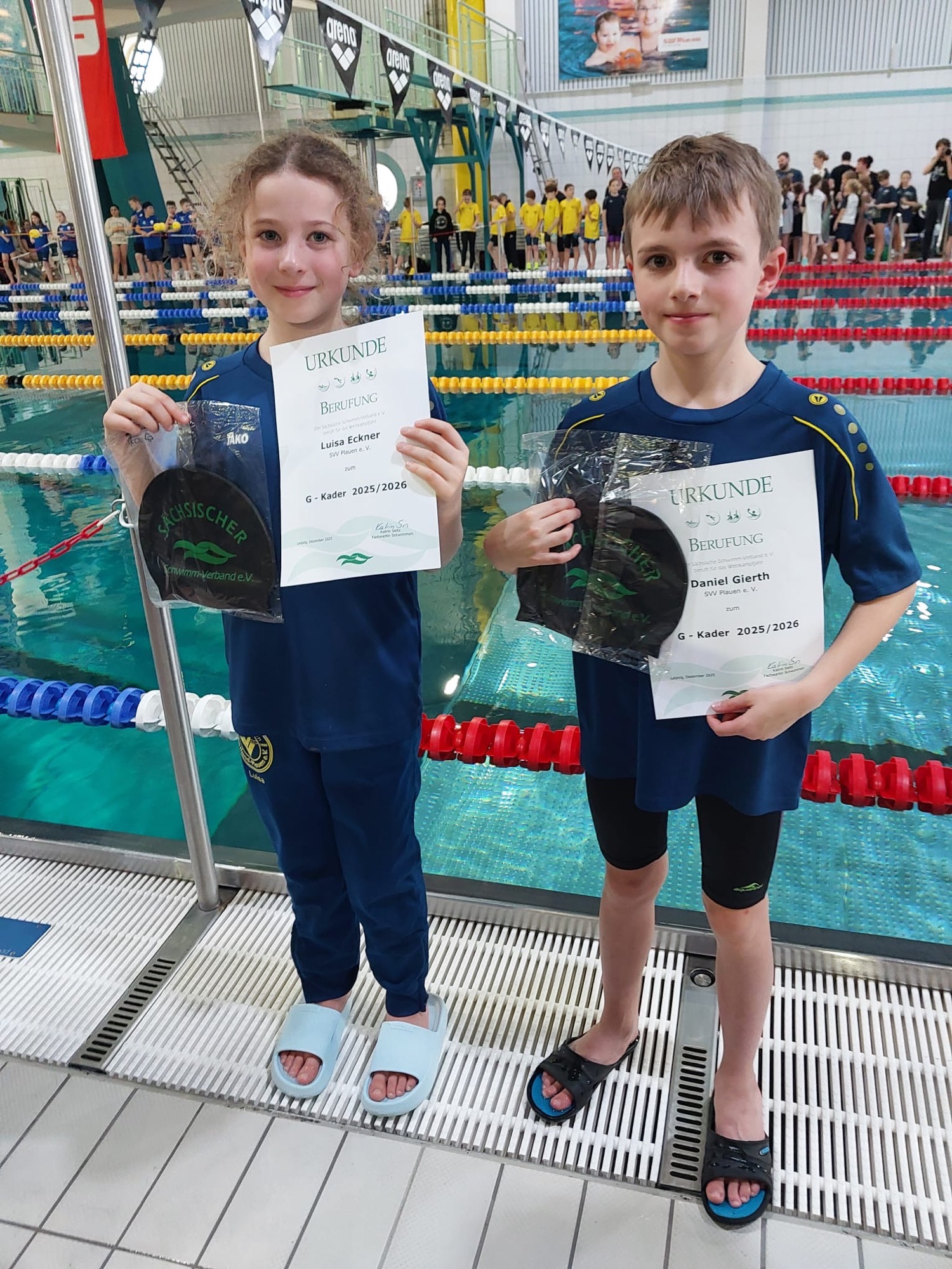 Ausserdem wurden an diesem Wettkampfwochenende die G-Kader des Sächsischen Schwimm-Verbandes für die Saison 2025/2026 berufen und geehrt. Hier sind wir stolz auf unsere drei Ausgezeichneten: